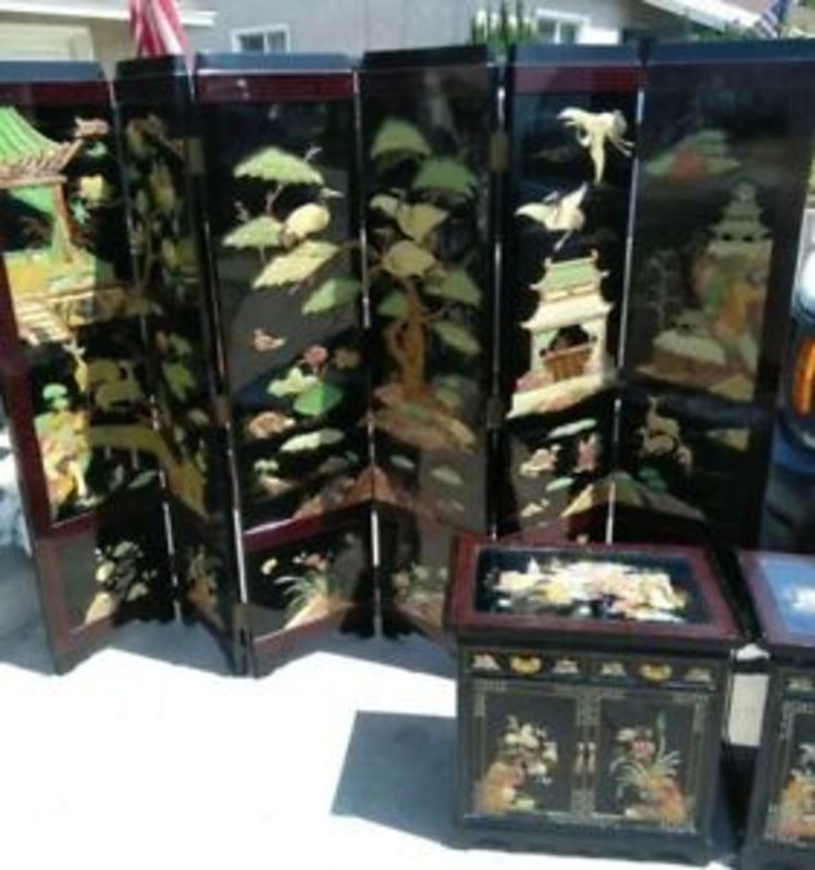 Beautiful vintage set black lacquer hand carved stones and mother of pearl inlay.